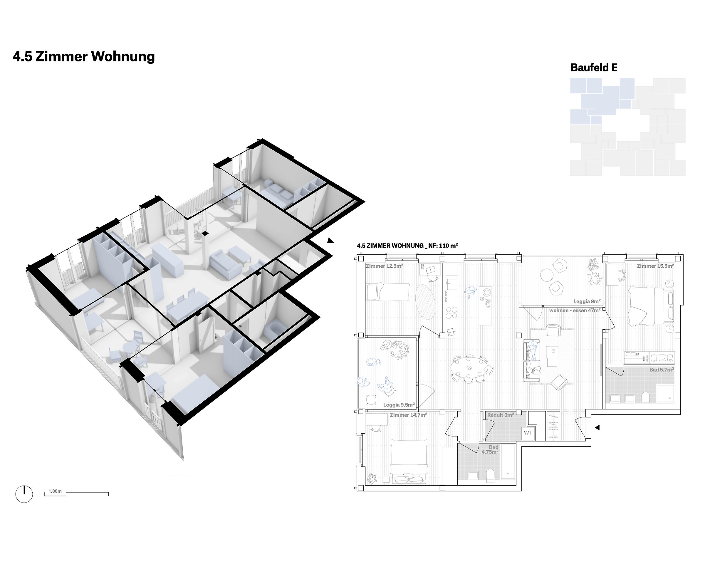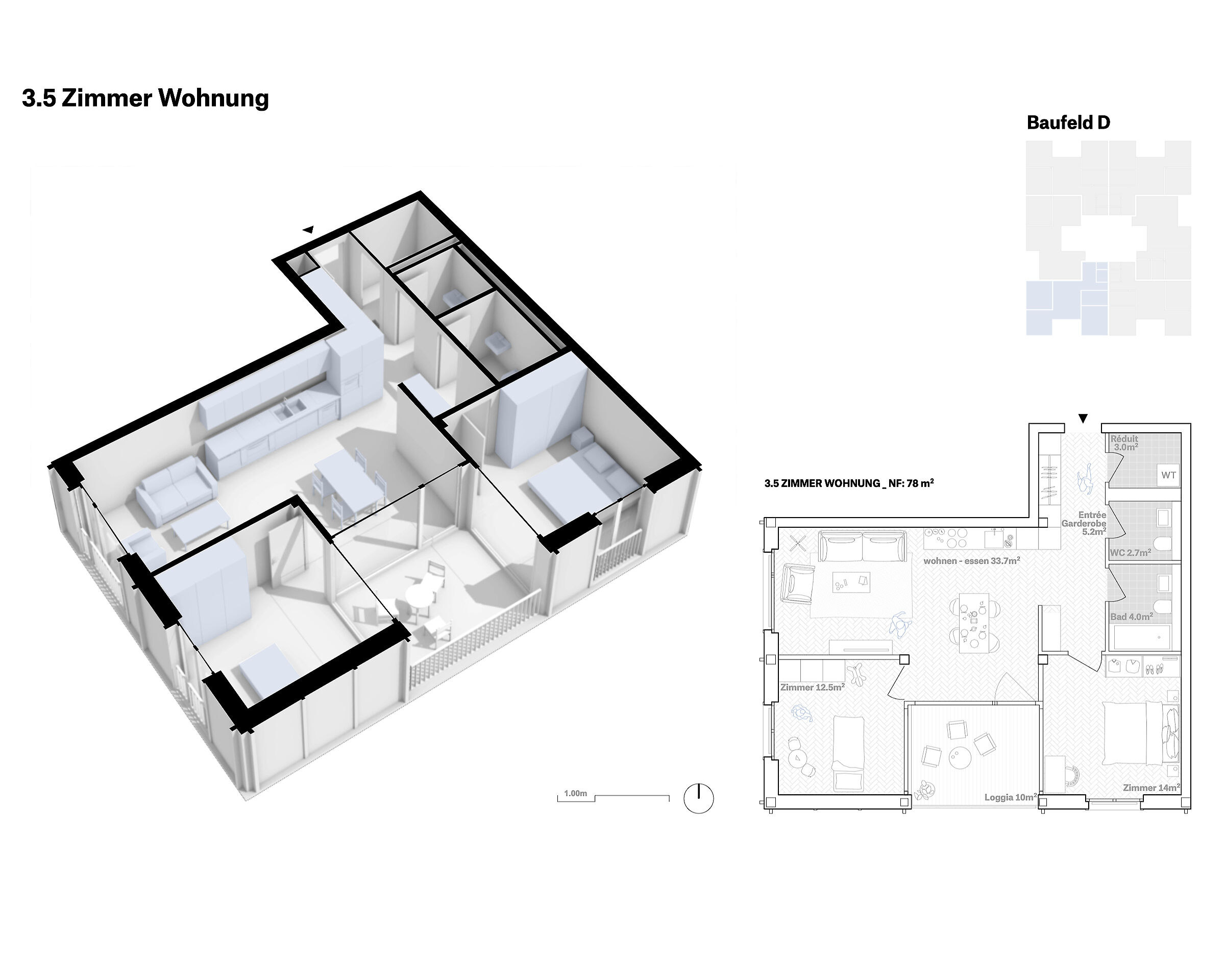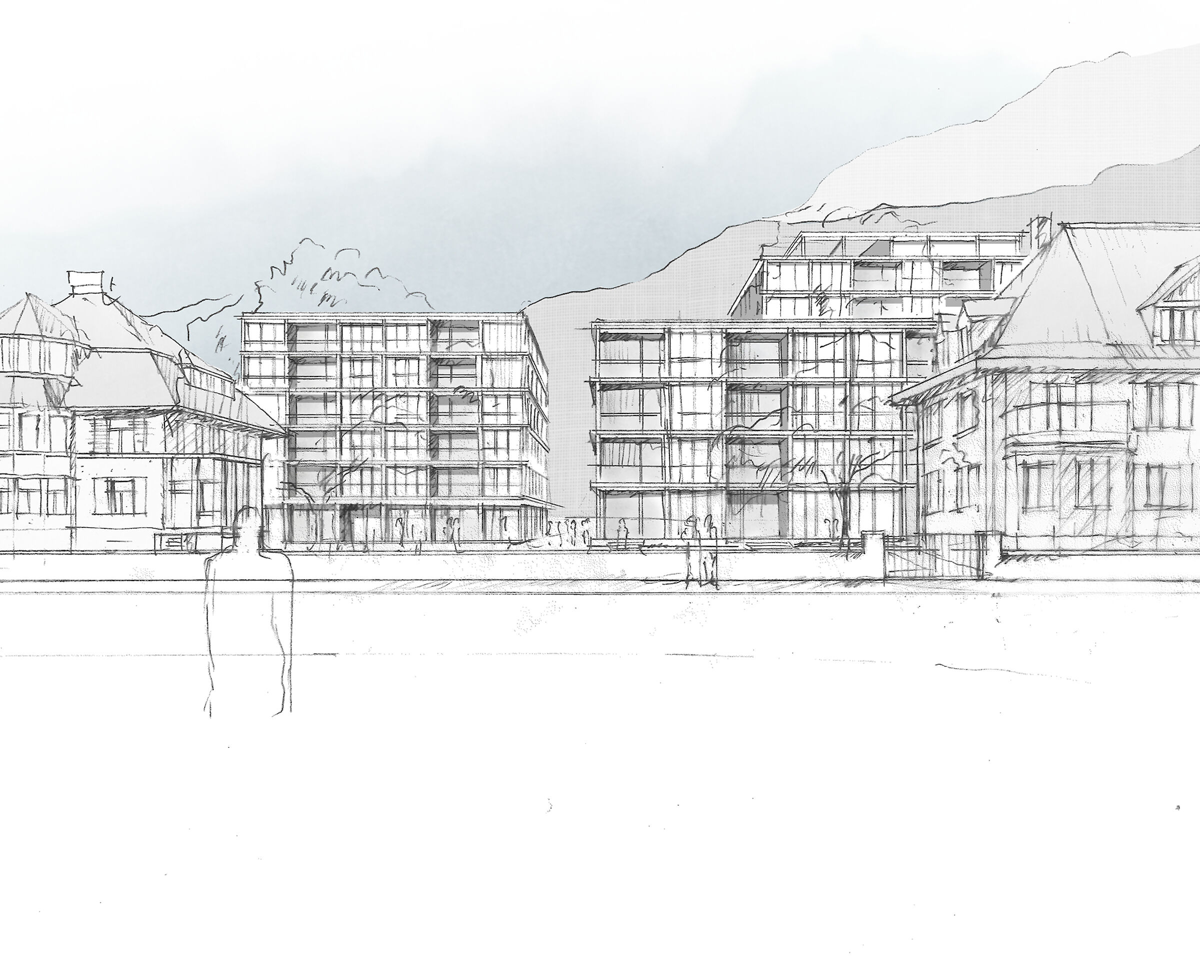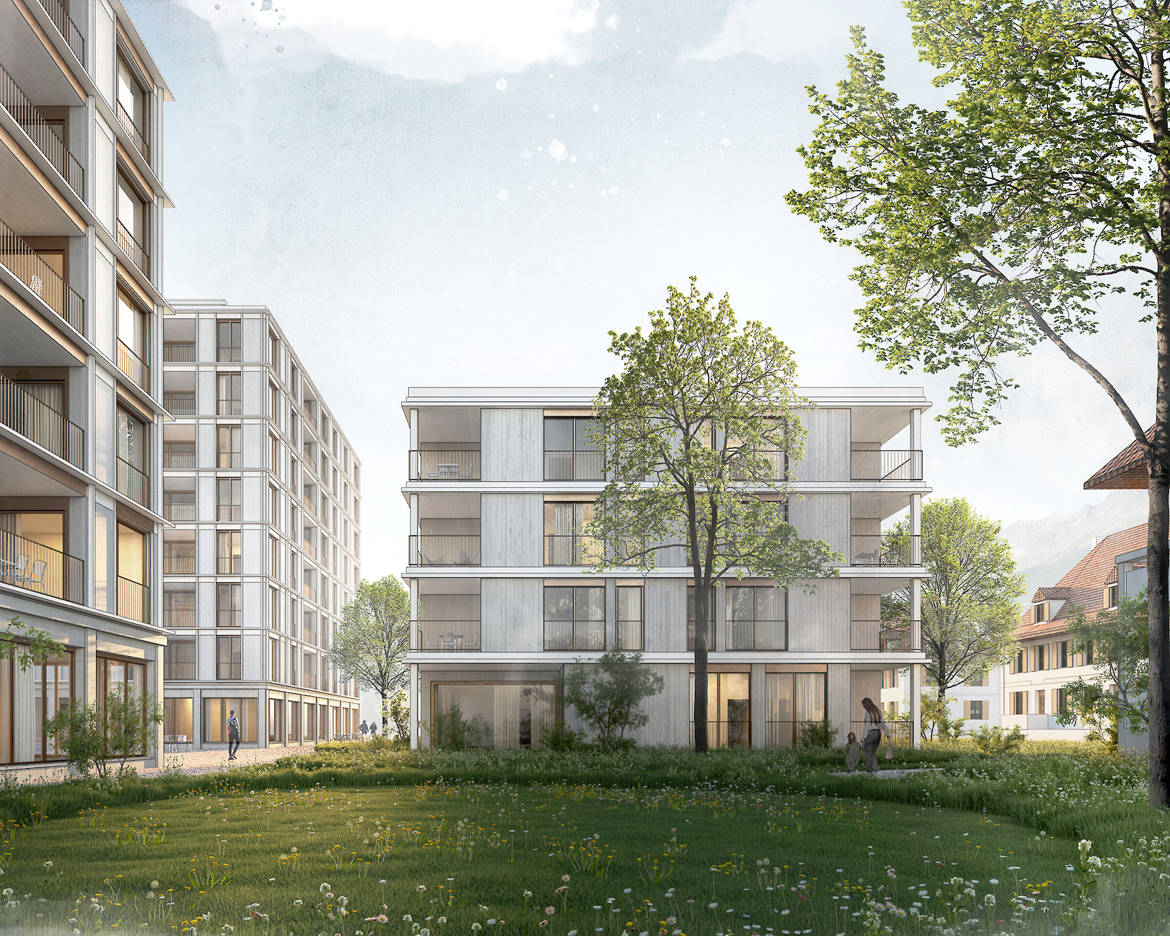 Lageeinflüsse wie der teilweise extreme Talwind und die grandiose Aussicht gegen Süden bestimmen den Entwurf. Die bestehenden, prägenden Landschaftselemente werden zu einem qualitätsvollen Aussenraum ergänzt und weitergestaltet. Dieser wird dank gezielten Durchwegungen offen und einladend und stellt sowohl für die Bewohner:innen als auch für die Bevölkerung einen Mehrwert dar.