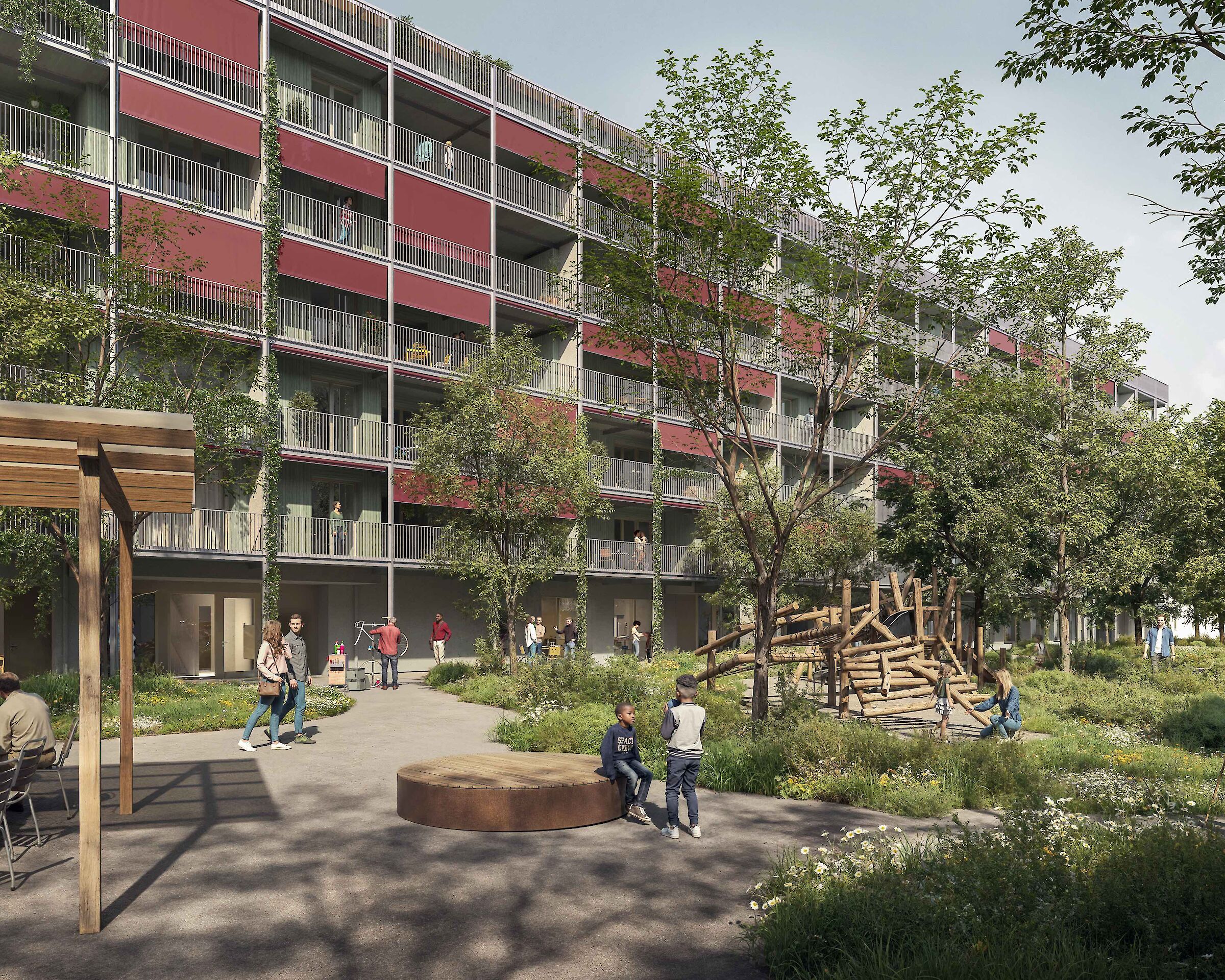 Im Zentrum der Gemeinschaft steht die neue Gartenanlage, welche geschützt und zur alleinigen Nutzung durch die Bewohner:innen im Innenhof zu liegen kommt. Der aufwendig gestaltete Aussenraum ist das Herzstück der neuen Siedlung Birs und schafft Raum für Begegnungen und Kommunikation.