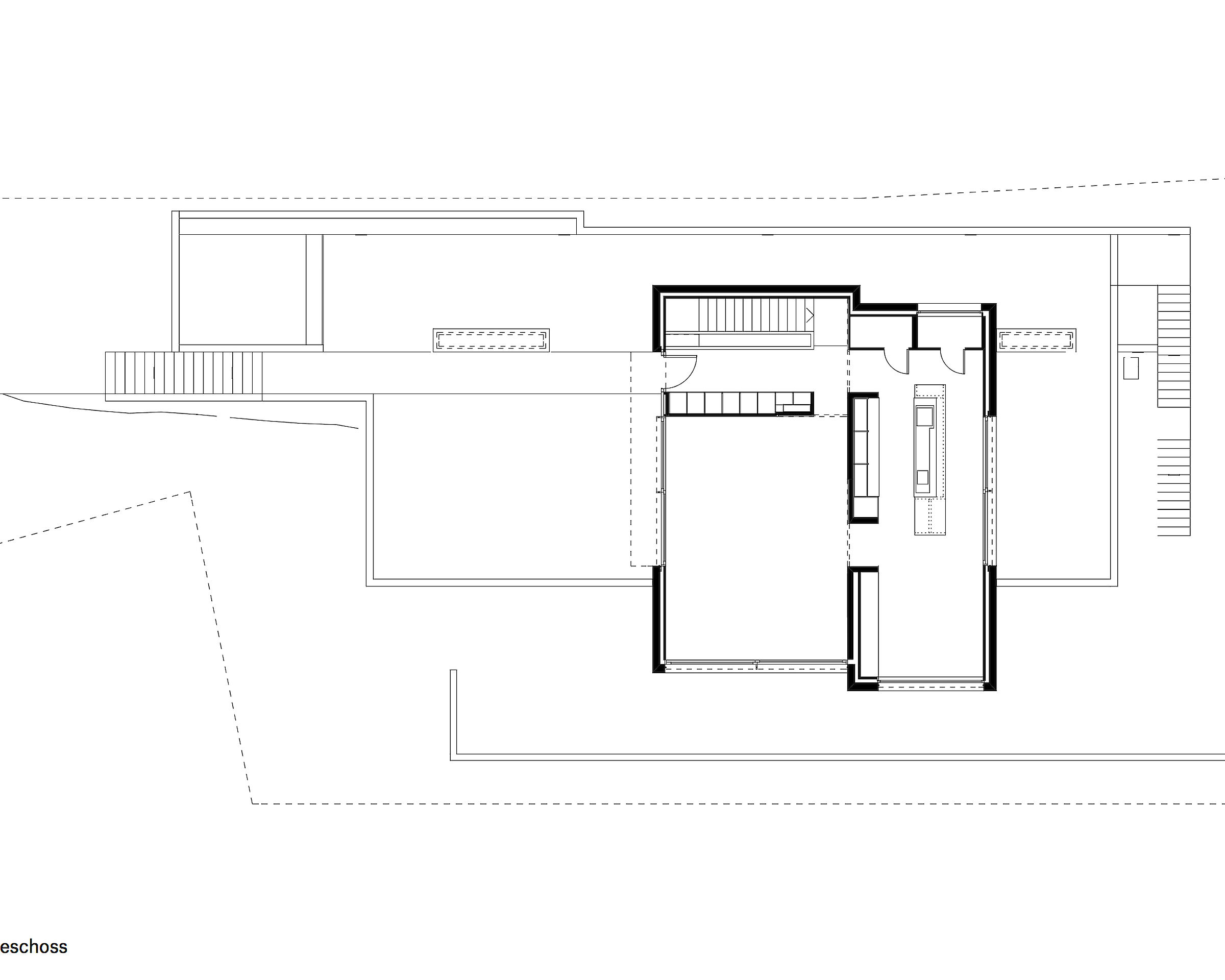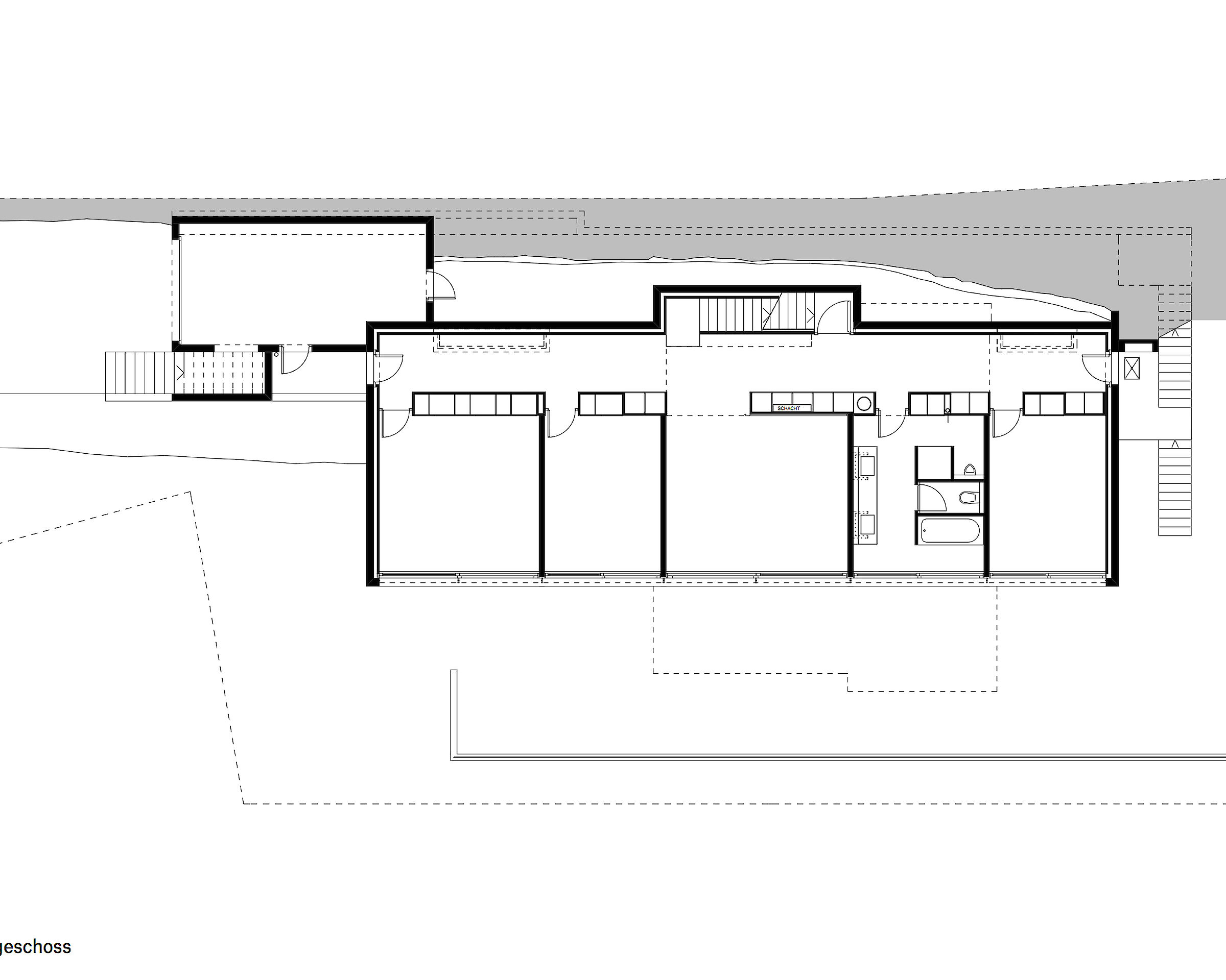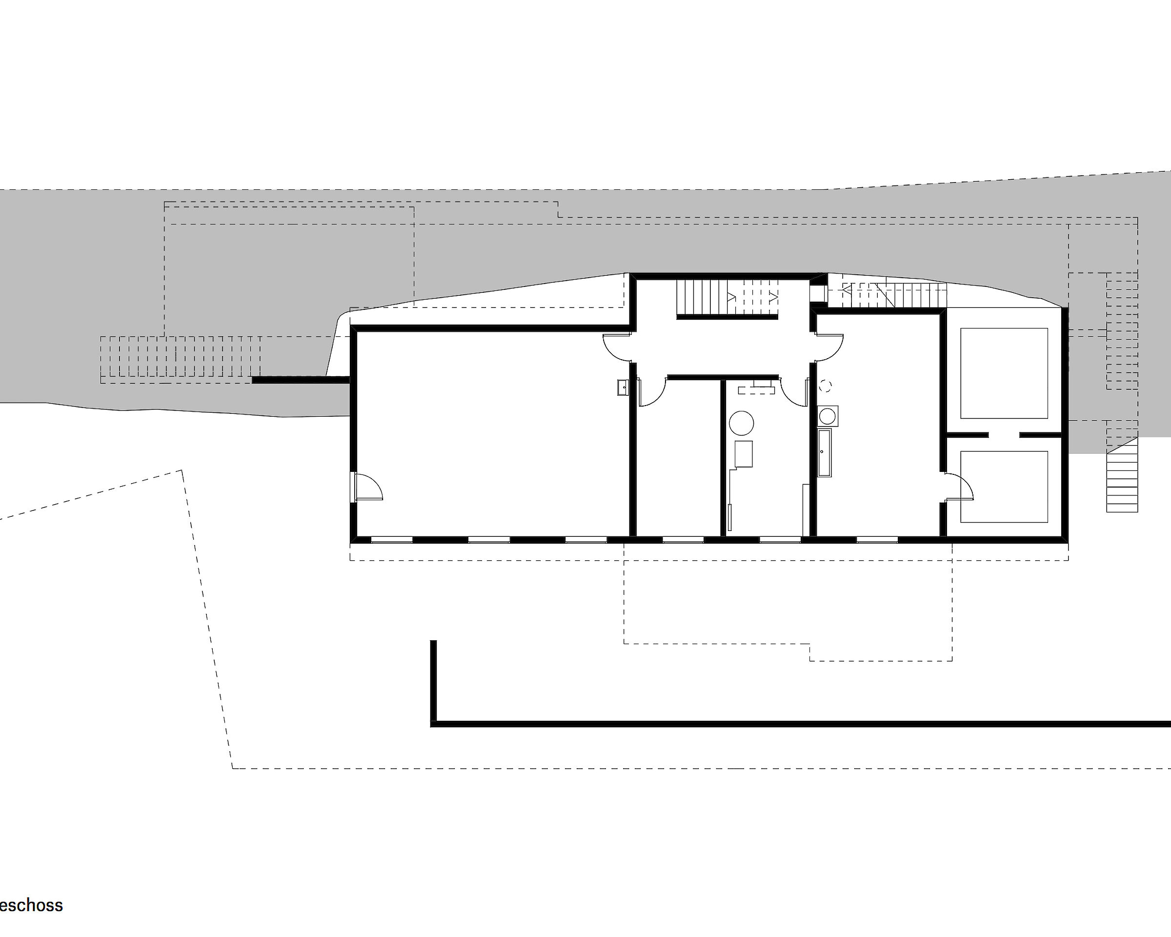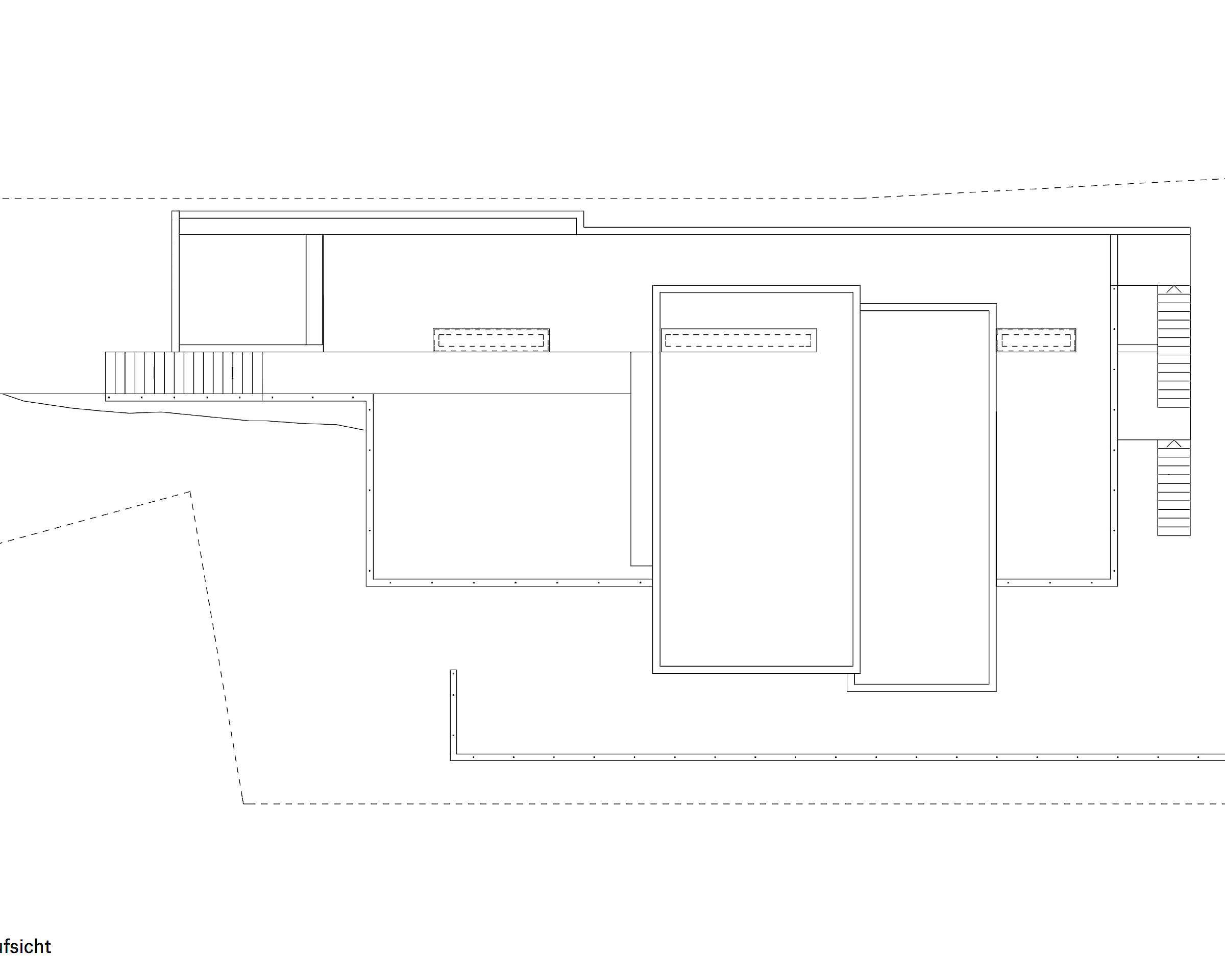 Zwei Baukörper sind derart aufeinandergeschichtet, dass trotz der schwierigen Geländesituation ein grosszügiger, ebener Aussenbereich entsteht. Das Schlafgeschoss bildet dabei den Sockel für das Wohngeschoss. Die Position des Wohngeschosses, quer zum Schlafgeschoss, ist so gewählt, dass im Osten und im Westen Aussenräume mit unterschiedlicher Qualität definiert werden.