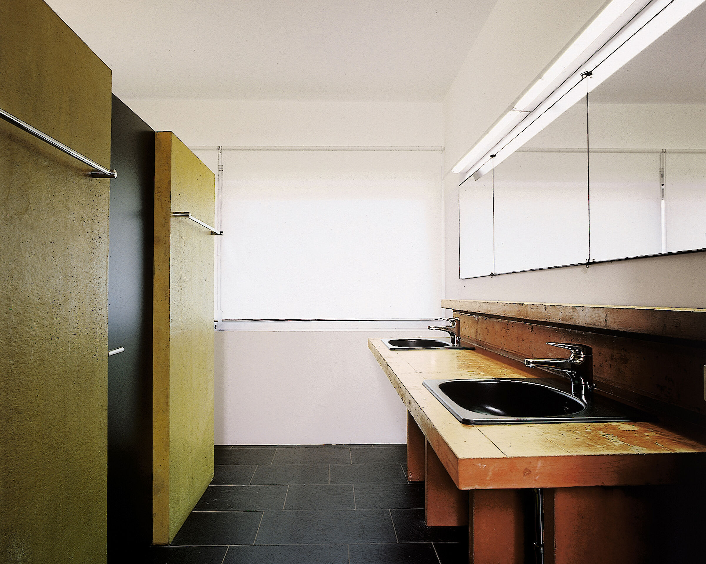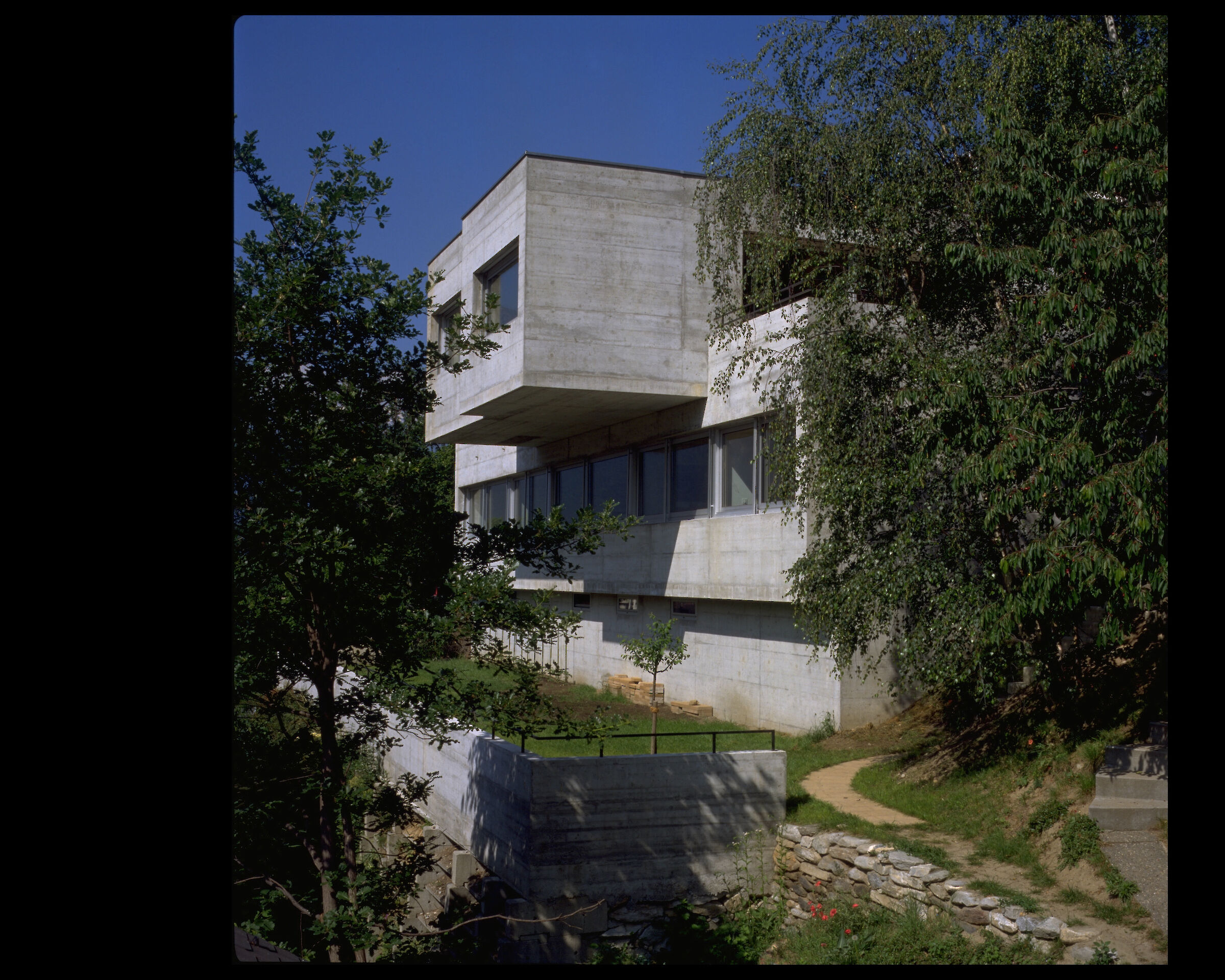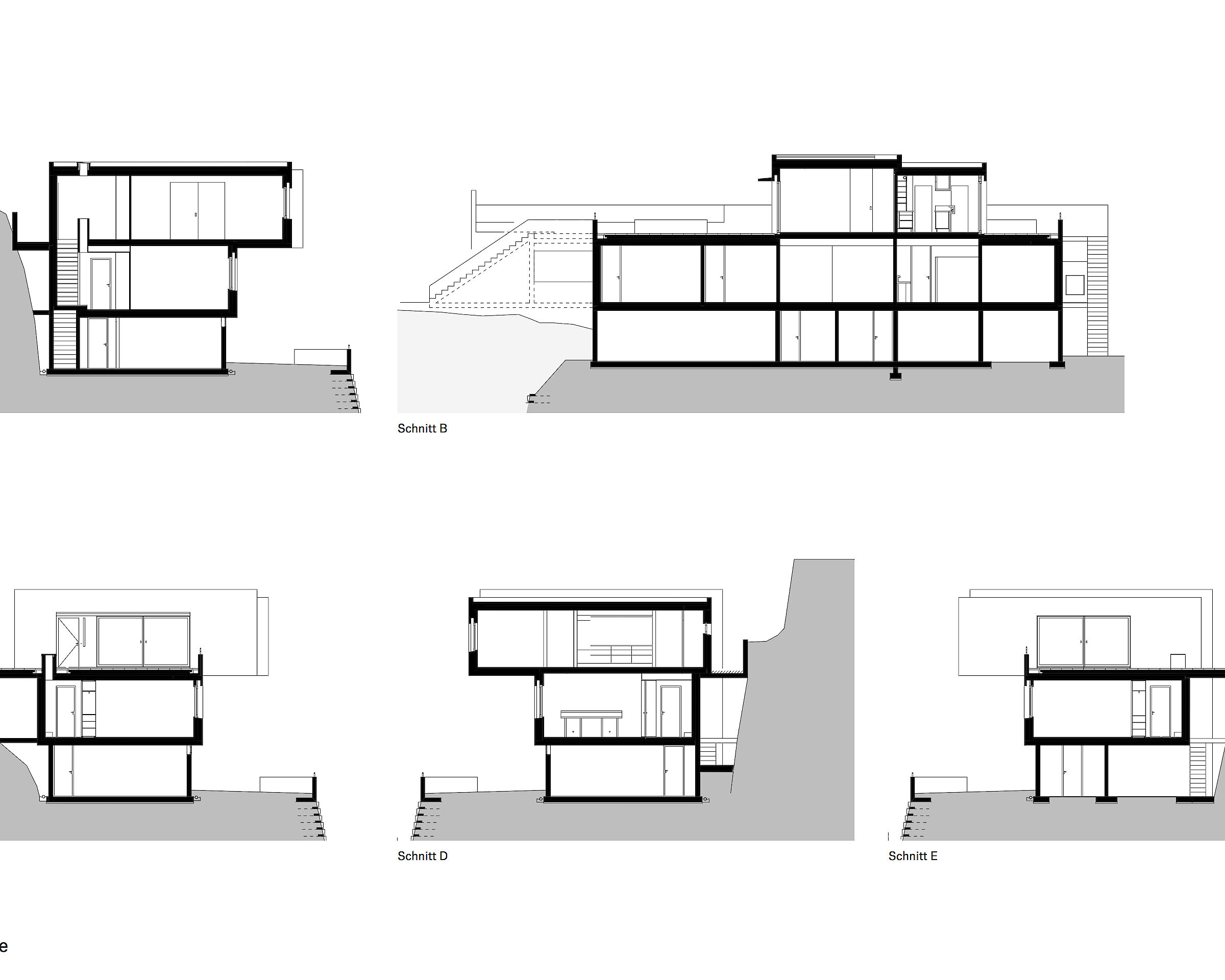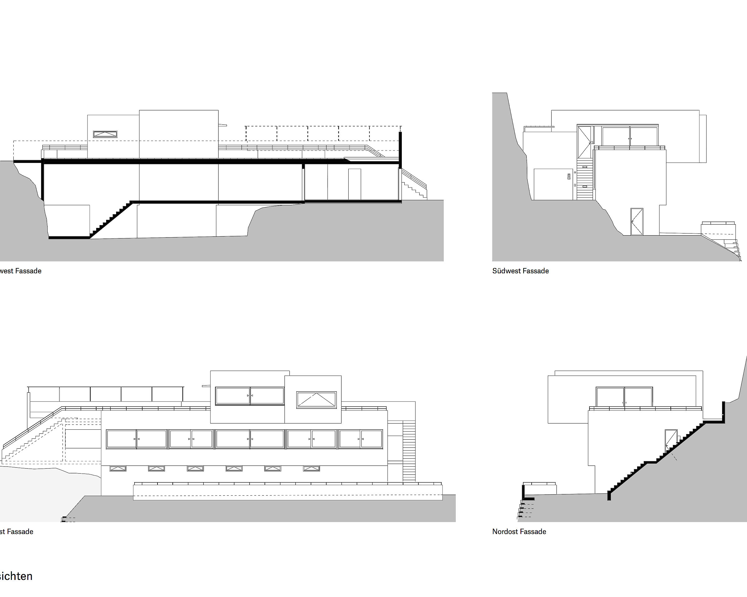 Zwei Baukörper sind derart aufeinandergeschichtet, dass trotz der schwierigen Geländesituation ein grosszügiger, ebener Aussenbereich entsteht. Das Schlafgeschoss bildet dabei den Sockel für das Wohngeschoss. Die Position des Wohngeschosses, quer zum Schlafgeschoss, ist so gewählt, dass im Osten und im Westen Aussenräume mit unterschiedlicher Qualität definiert werden.