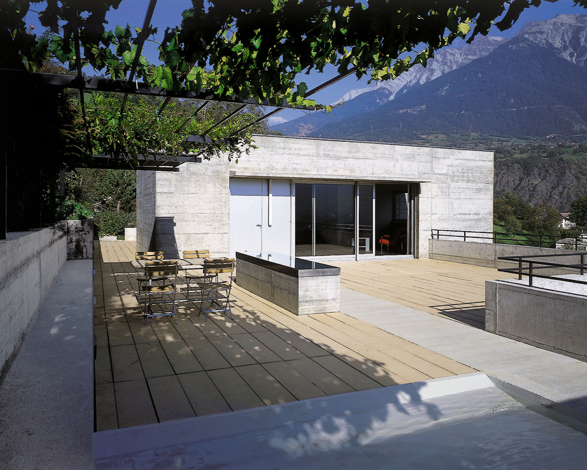 Das Wohngeschoss orientiert sich mit grossen Schiebefenstern zur vorgelagerten Terrasse mit Blick auf das Simplongebiet. Das Schlafgeschoss ist ausschliesslich nach Süden orientiert. In Anlehnung an das felsige Gelände ist das Haus in Sichtbeton ausgeführt. Die Betonteile im Inneren des Hauses weisen im Gegensatz zur rohen Aussenfassade eine glatte, weiss verputzte Oberfläche auf.