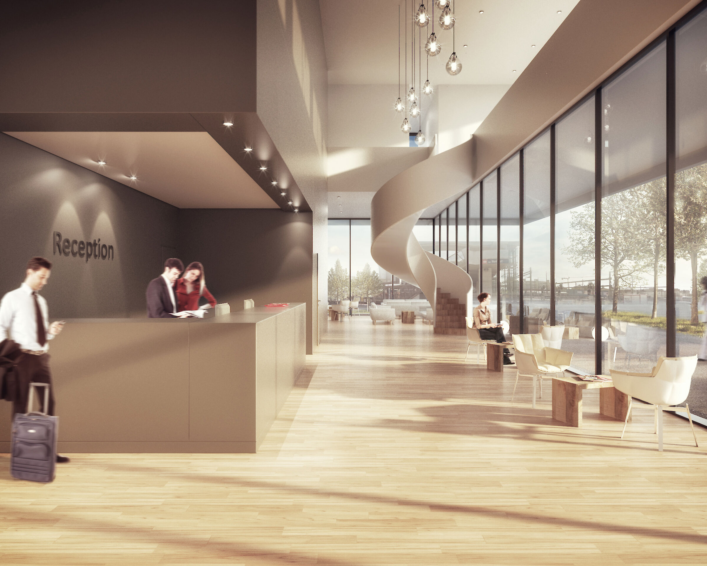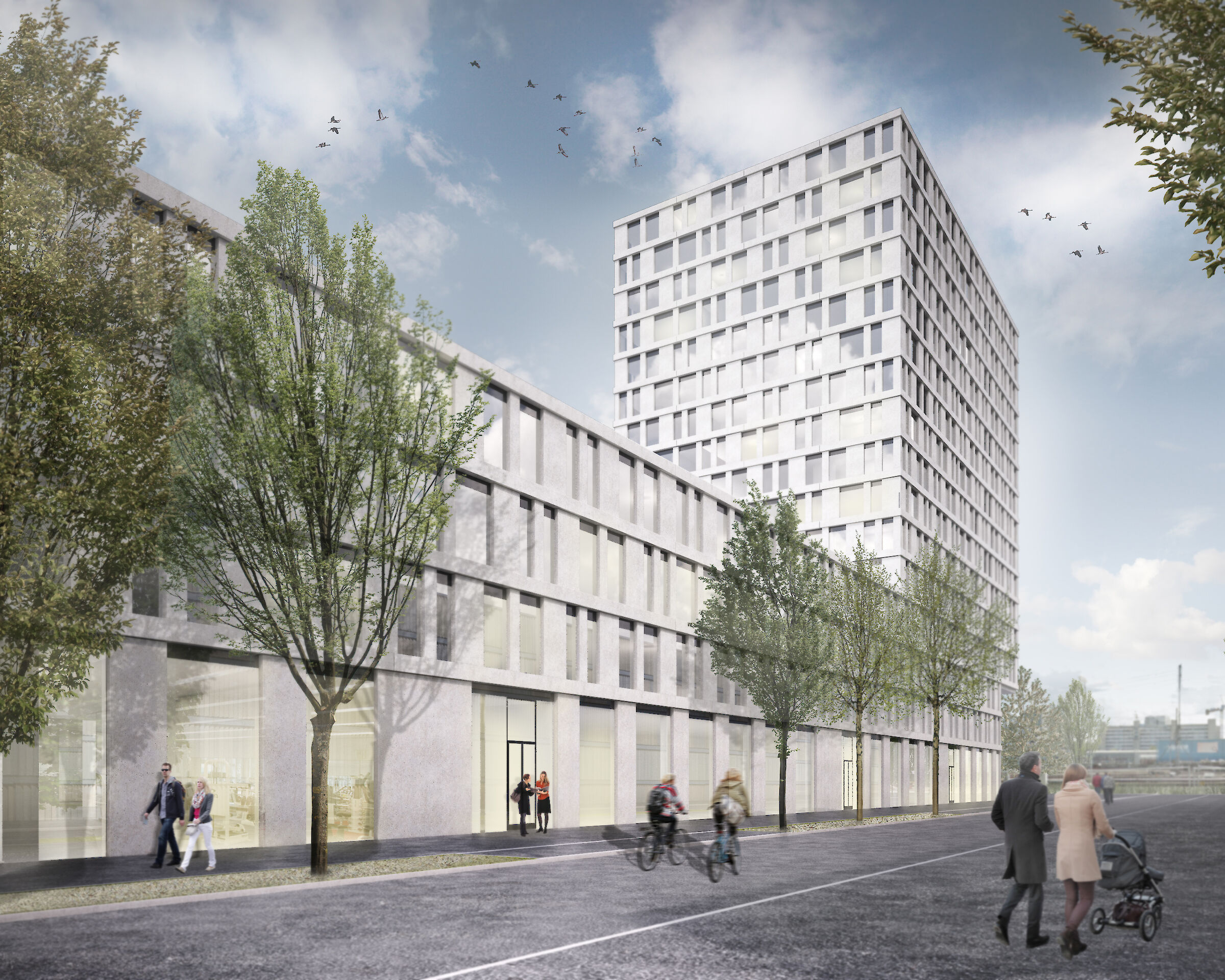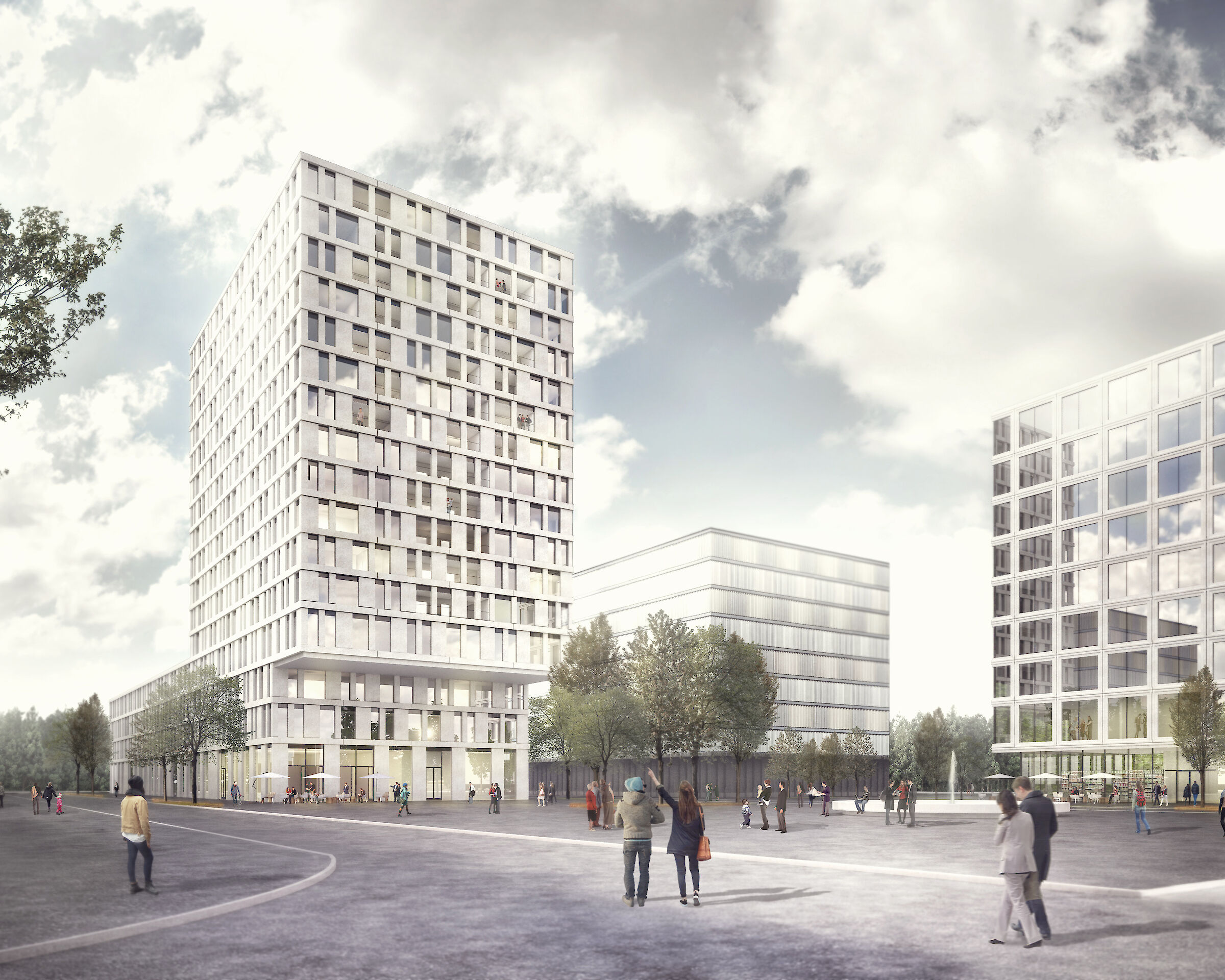 Dem strengen Bebauungsplan folgend, werden die beiden Gebäude volumetrisch klar gefasst. Die gegen den Platz hin zurückgeschnittenen Volumen verstärken die räumliche Situation der öffentlichen Bereiche und definieren den Übergang zu den halböffentlichen Erdgeschossnutzungen. Das Hochhaus ragt mit seinen oberen Geschossen in den Strassenraum der Wankdorfallee und unterstreicht so seine stadträumliche Bedeutung.