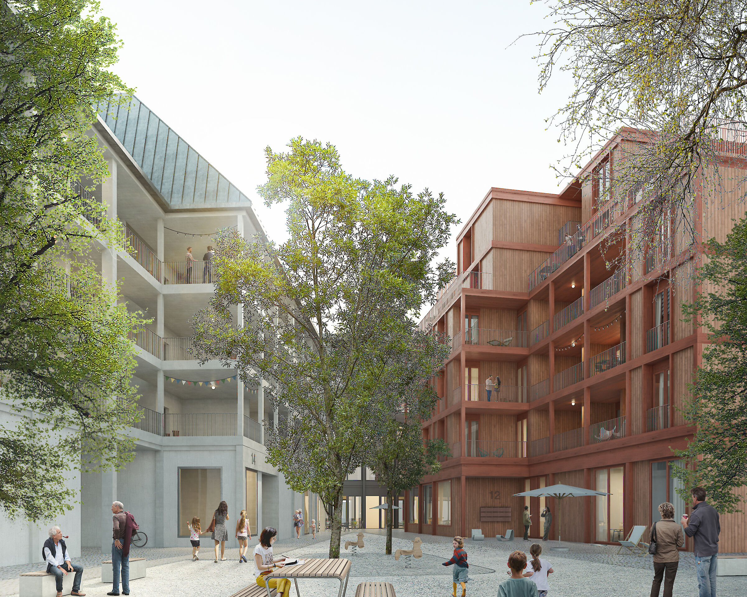 Die neue Bebauungsstruktur schafft eine sensible Implementierung von Gebäudevolumen, die im Gegensatz zu den monostrukturellen Nachbartypologien angemessene und belebte Freiräume im Sinne eines Quartiers mit eigener Identität bietet.